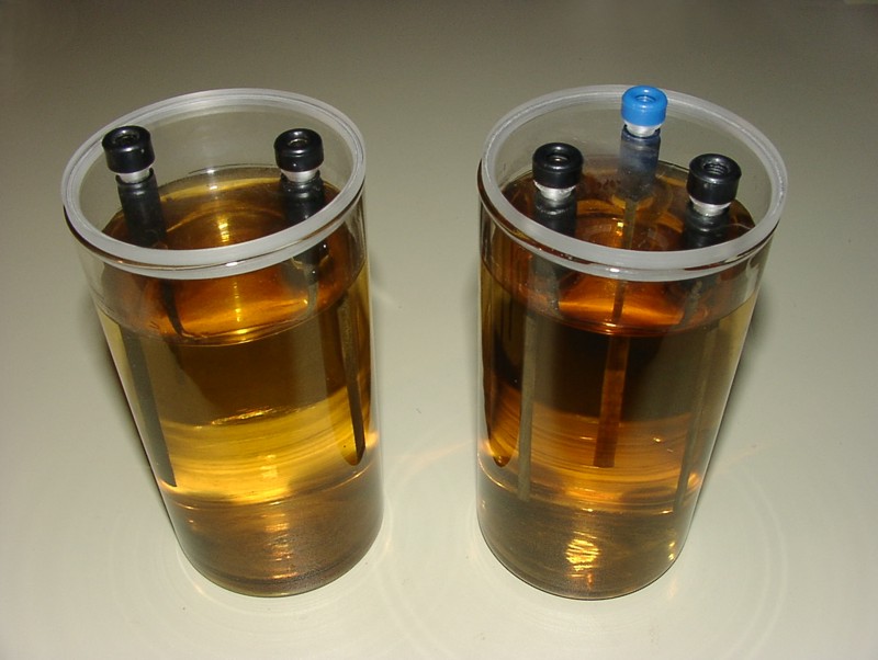 Gleiche Proben wie oben nach 12 Stunden Nach 12 Stunden Standzeit über Nacht (ohne Anschluss an das Gerät) hat sich das Bild etwas gewandelt. Beide Proben sind nachgedunkelt. Die linke ist zwar immer noch heller, entspricht aber in etwa der klar-gelben Färbung der rechten Probe. Der zuvor trübe Anteil der linken Probe ("2 Elektroden-Anordnung") ist abgesunken. Die rechte Probe ("3 Elektroden-Anordnung") hatte keine Eintrübungen.