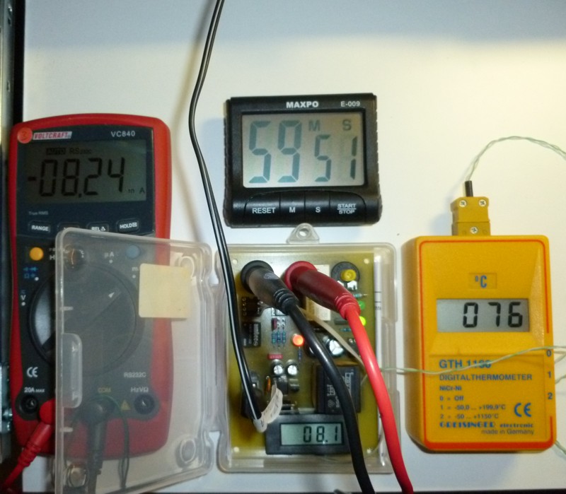 Temperaturmessung am Trafo, 76 Grad C gleichbleibend nach 1 Stunde unter Kurzschlußbelastung, Elektrodenstrom 8,24 mA