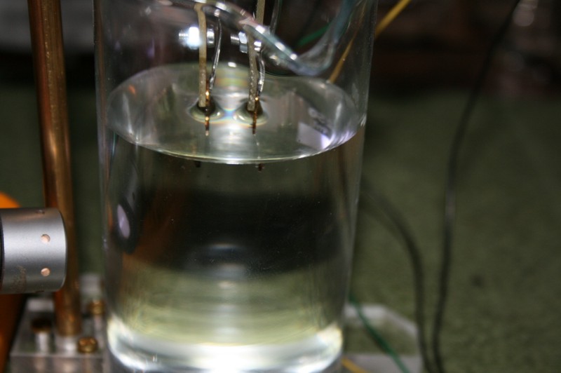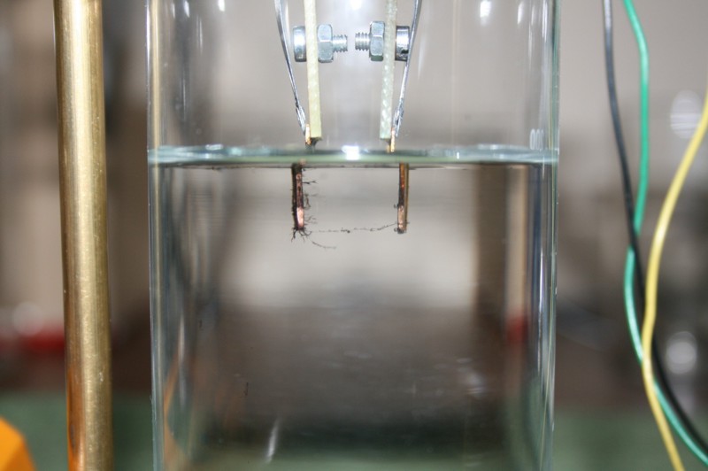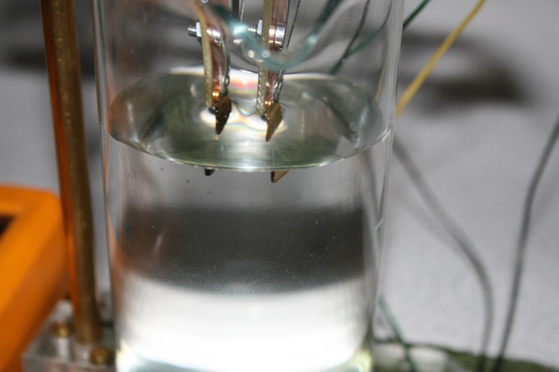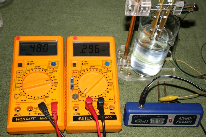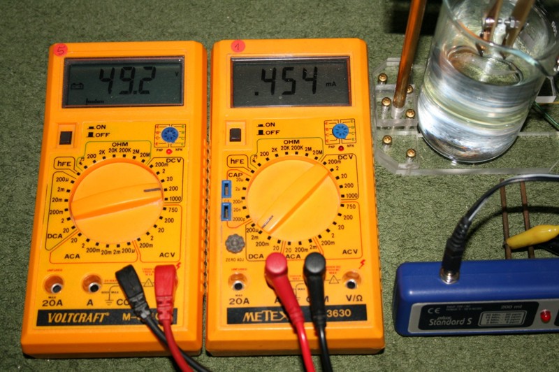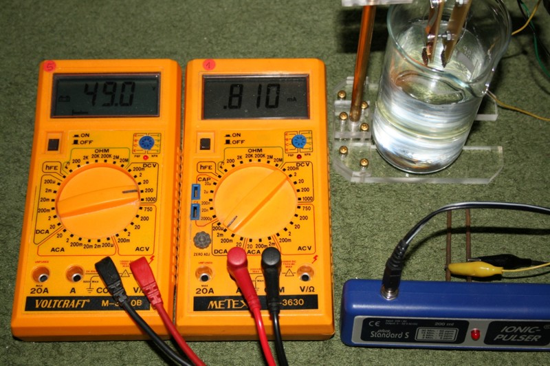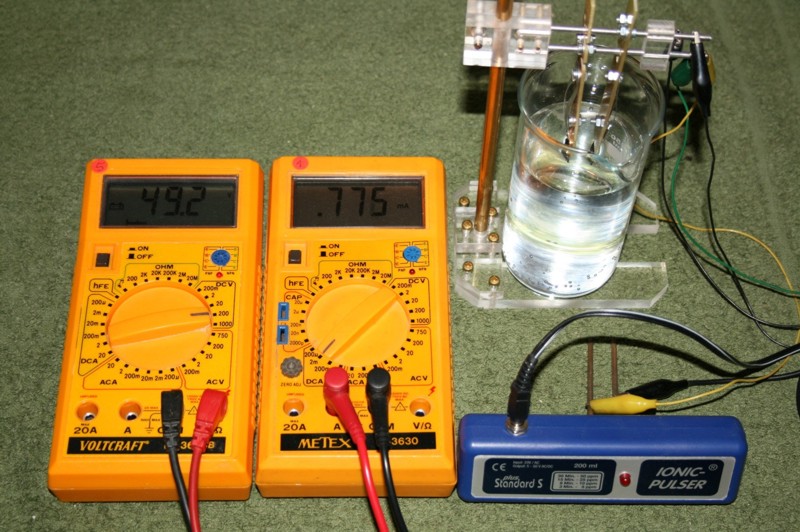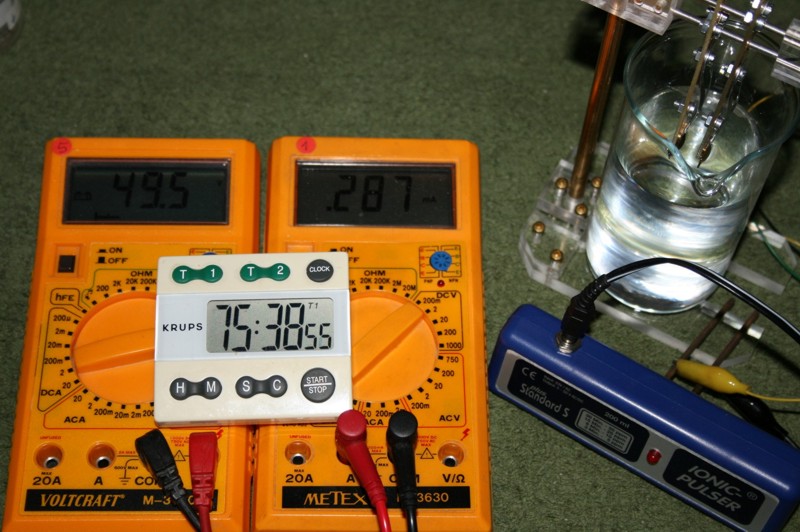 Anordnung: (Anmerkung zum Anfangsstrom: Bei einem späteren Test mit kaltem Wasser von 20 Grad C ergab sich ein Anfangsstrom von nur 0,18 mA.) Strom-Messungen: Der Wert von 0,4 mA scheint nicht weiter zu steigen. Ab Mitte des Experimentes (16. Tag) erhöht sich der Strom auf ca. 0,8 mA. Eine Ursache, wie Dendritenbildung oder anderes ist nicht erkennbar. Ergebnis: Es ist anzunehmen, daß die aufgewandte elektrische Energie allein für die Aufspaltung in Sauerstoff und Wasserstoff drauf ging und daß eine Abscheidung von Gold bei dieser Spannung nicht nennenswert oder nicht in ganzen ppm-Werten gegeben ist. Da die Auflösung der verwendeten Labor-Analysenwaage 0,01 mg beträgt und die Wassermenge 200 ml, ist auf Grund der Tatsache, daß der Gewichtsverlust nicht meßbar ist, anzunehmen, daß er weniger als 0,01 mg beträgt. Somit wäre der nach 28 Tagen Einschaltdauer erreichte ppm-Wert kleiner als 0,05 ppm. (umgerechnet von 200 ml auf 1 Liter)