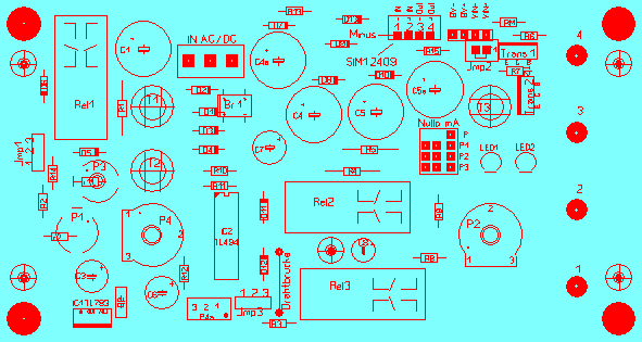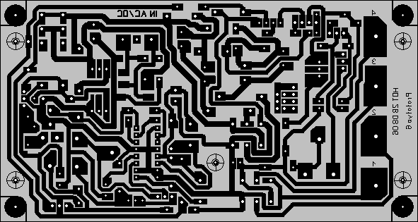 Das Layout ist für die Vollversion des Prototypen 6 konzipiert. Die vereinfachten Versionen 1. und 2. Ausbaustufe lassen sich darauf ebenfalls aufbauen.. Einige Bauteile sind im Bestückungsplan verzeichnet, aber im Layout nicht vorgebohrt. Das hat seinen Grund dann, wenn man diese Bauteile wahlweise, "entweder oder" verwenden kann. Für die Dioden D1 - D4 sind z.B. zwar die Lötflächen vorhanden, die Löcher aber nicht gebohrt. Hier wird überwiegend ein Brückengleichrichter verwandt werden. Tip: Die gegebenen Bohrlöcher passen für einen Brückengleichrichter im DIL-Gehäuse. Der läßt sich in eine 6-polige IC-Fassung stecken. Die beiden mittleren Pins der IC-Fassung kneift man ab, da keine Löcher dafür vorhanden sind. Kühlung: Bei Eingangsspannungen von über 40 Volt DC muß der TL783 verwandt werden. Außerdem ist dann eine Kühlfläche nötig. Am besten eignet sich dafür ein flaches Stück Aluminiumwinkel, wie auf dem Foto ersichtlich. (Der Kühlkörper darf keine Verbindung zu Minus/Masse oder Plus haben.)