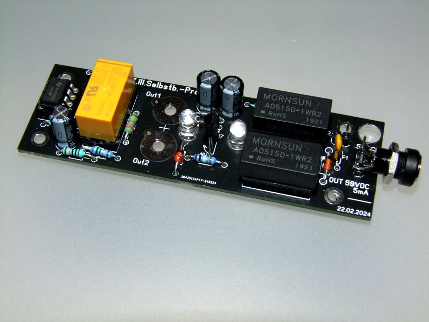 Die neue fertig gelötete Platine mit den DC-Wandlern und dem Relais