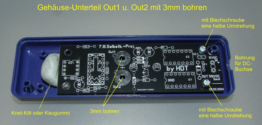 Das Bild unten kennen wir schon von Seite 2. Wer die Variante mit den innen liegenden Elektrodenanschlüssen vorgesehen hat, muss die Bohrlöcher für Out1 und Out2 noch auf 6mm aufbohren. Sowohl auf der Platine, als auch am Gehäuse-Unterteil. (am Gehäuse-Oberteil hingegen wird nichts mehr gemacht)