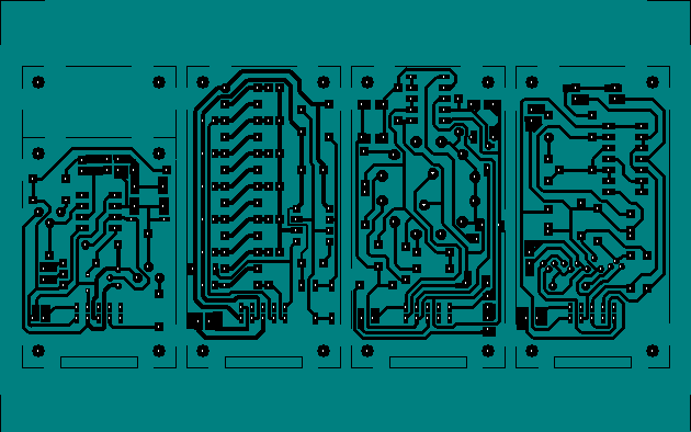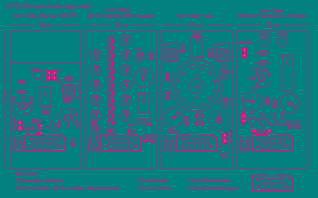 Die Platinen-Layouts der einzelnen Baugruppen wurden ebenfalls auf einer Europlatine 100 x 160 mm belichtet und geätzt. Sie können später ausgeschnitten und in anderer Reihenfolge oder auch vertikal übereinander montiert werden, je nach gewähltem Gehäuse. Zur Verbindung ist die Basisplatine nicht mehr unbedingt erforderlich. Es genügt ein einziges Flachbandkabel mit mehreren Pfostensteckerabgriffen. (ähnlich einem Festplatten-Kabel) Bild 3: Gesamtplatine Bohrlöcher: 0,8 mm alle vorbohren, 0,9 mm Schalter, Stifte, Jumper, Wannenstecker, 1,0 mm Dioden, 1,2 mm Trimmer, 1,3 mm Drehschalter, 3,0 mm Eckbefestigungen (alles übrige 0,8 mm)