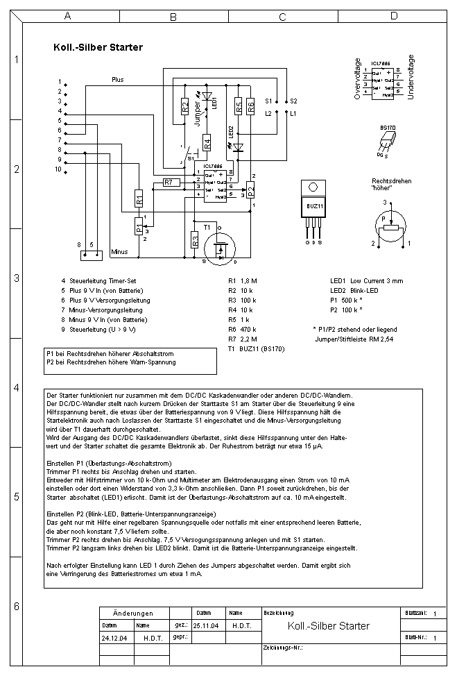 Und zuletzt der Starter: Er erfüllt mehrere Aufgaben. zunächst einmal ist er der Lastschalter des Timers und hält mit diesem zusammen nach dem Starten die gesamte Elektronik einschließlich sich selbst eingeschaltet, bis der Timer abschaltet. Dann unterbricht der Starter nämlich die Stromzufuhr und es bleibt nur ein Ruhestrom von ca. 15 µA. Ebenso unterbricht der Starter die gesamte Stromversorgung bei Überlastung am Elektrodenausgang. (schlechte Wasserqualität, Kurzschluß etc.) Außerdem ist er auch noch "Batteriespannungskontrolle". Blatt 4: Der Starter