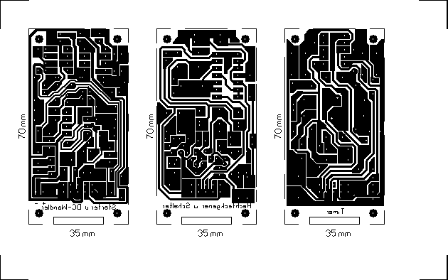 Die Platinen-Layouts der einzelnen Baugruppen wurden ebenfalls auf einer Europlatine 100 x 160 mm belichtet und geätzt. Sie können später ausgeschnitten und in anderer Reihenfolge oder auch vertikal übereinander montiert werden, je nach gewähltem Gehäuse. Zur Verbindung ist die Basisplatine nicht mehr unbedingt erforderlich. Es genügt ein einziges Flachbandkabel mit mehreren Pfostensteckerabgriffen. (ähnlich einem Festplatten-Kabel) Bild 3: Gesamtplatine (Achtung! Fehler im Layout wurde korrigiert. Brücken von T5 u. T6 müssen von Gate nach Source liegen.) Bohrlöcher: 0,7 mm alle vorbohren - 0,9 mm Stifte, Jumper, Wannenstecker, Diode D1 - 1,0 mm Trimmer, Taster - 1,3 mm Drehschalter - 3,0 mm Eckbefestigungen (alles übrige 0,7 mm)