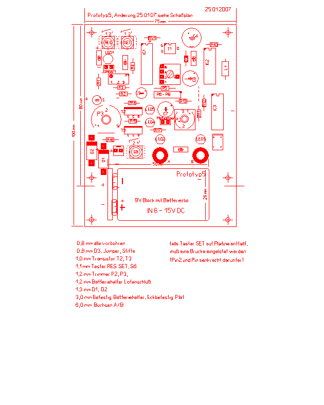 Prototyp5 Schaltpläne/Platinen-Layout Letzte Änderung 29.09.2010 (Siehe Schaltplan 2) Änderung 25.01.2007 Es wurde der Elko C 4,7µF zwischen Pin1 des IC1 und Plus hinzugefügt. Layout und Bestückungsplan (siehe unten) wurden entsprechend geändert. C verhindert ungewolltes Selbststarten des Timers nach Anschluß der Stromversorgung (tritt nur bei Stromversorgung mit Netzteil auf).