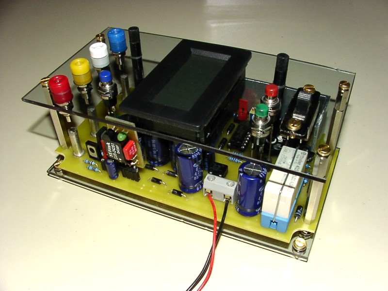 Die Platine als Vollversion für den Gehäuseeinbau... Auffallend die Relais (selbstverständlich auswechselbar in Steck-Fassungen und mit Haltebügeln gesichert) und die relativ große Elko-Speicherbatterie. -------------------------------------------------------------