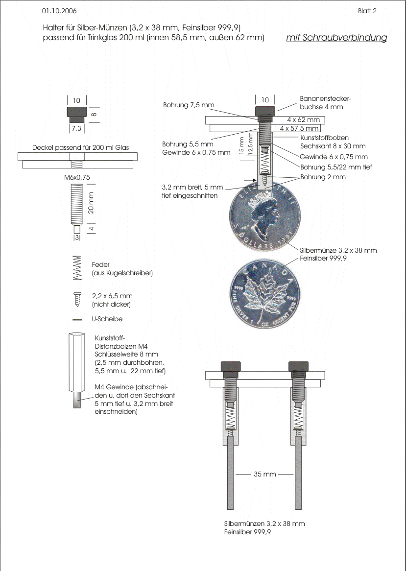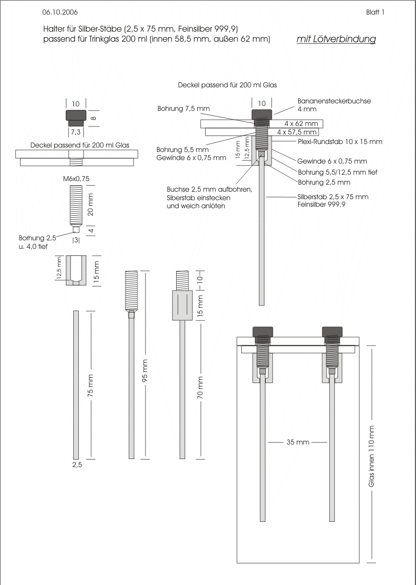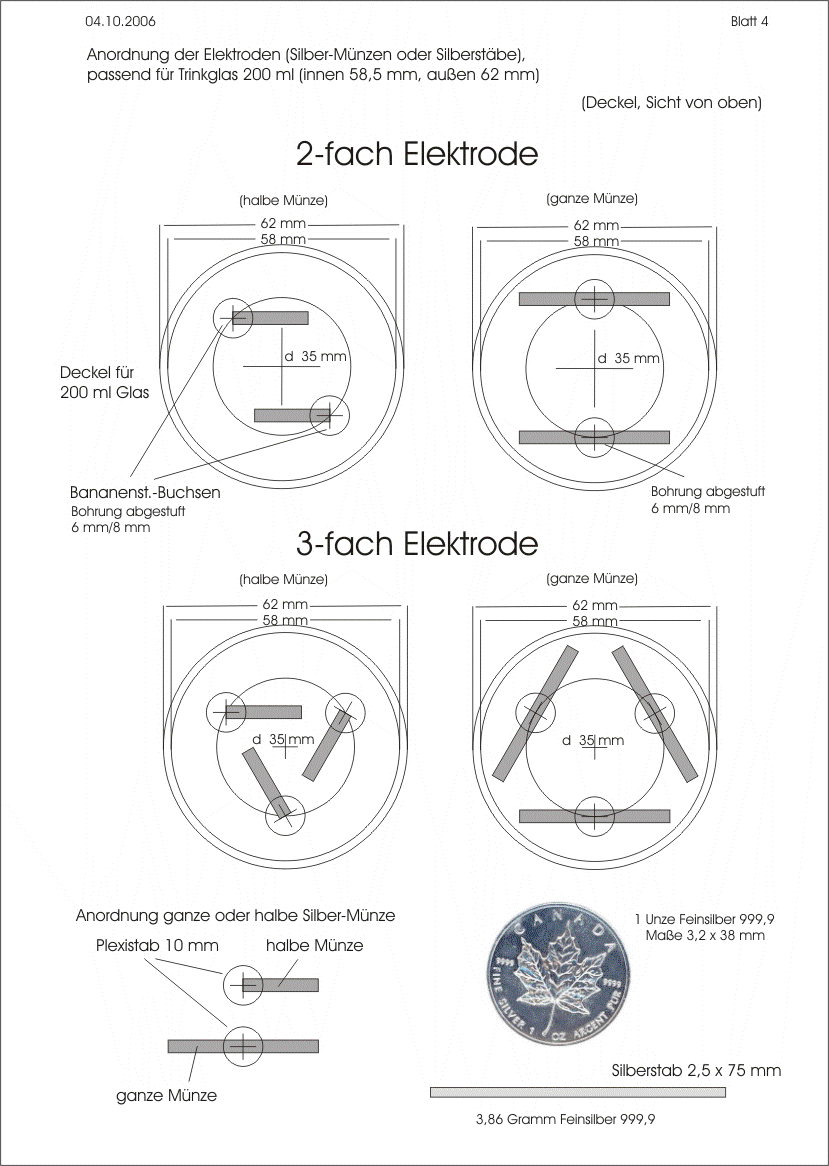 Prototyp6 Alternativ zu den im Handel angebotenen Standardmaßen sollen für den Prototypen 6 auch andere Elektodentypen vorgeschlagen werden. Gründe dafür sind die schwierige "und vor allem unsichere" Beschaffbarkeit von Silber 99,99 % = 999,9 und der relativ hohe Preis. Es ist auch Silber 99,999 % = 999,99 erhältlich, von noch höherer Reinheit, aber entsprechend schwieriger zu beschaffen. Diese höchste Qualität ist nicht erforderlich, doch dort, wo sie lieferbar ist, unter Umständen nicht nennenswert teurer. Es lohnt sich also, nachzufragen.