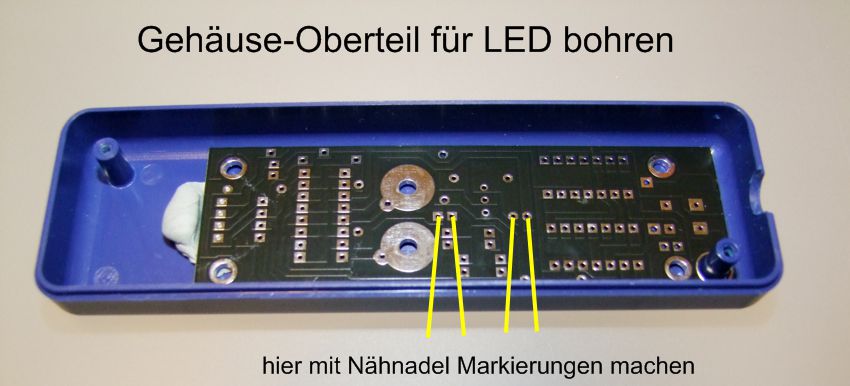 Das Bild unten kennen wir schon von Seite 2. Wer die Variante mit den innen liegenden Elektrodenanschlüssen vorgesehen hat, muss die Bohrlöcher für Out1 und Out2 noch auf 6mm aufbohren. Sowohl auf der Platine, als auch am Gehäuse-Unterteil. (am Gehäuse-Oberteil hingegen wird nichts mehr gemacht)