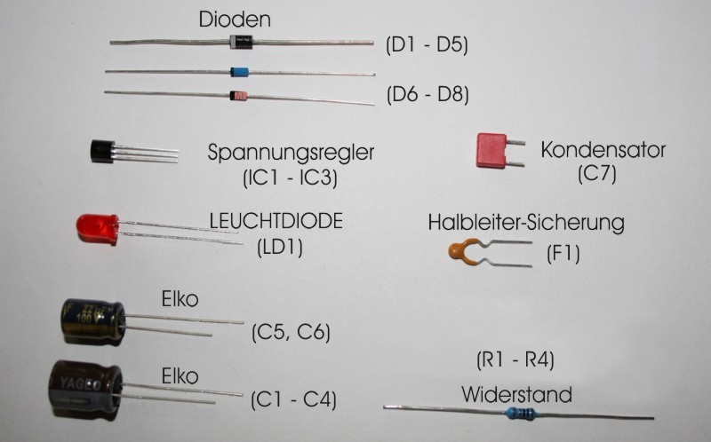 Die Markierung der Bauteile: Es tritt niemals der Fall auf, daß man nicht feststellen kann, wie herum man ein Bauteil einsetzen muß. Alle gepolt einzusetzenden Bauteile haben eine Markierung. Die Dioden haben einen schwarzen oder silbernen Ring an einem Ende, das entspricht dem Plusanschluß (+). Elkos haben in der Regel eine breite Markierung au der Minusseite mit dem Minuszeichen versehen. (-) Außerdem ist der Anschlußdraht auf der Minusseite kürzer. Die Leuchtdioden haben an der Rundung, wo die Anschlußdrähte herauskommen, eine Abflachung auf der Minusseite, und auch dort ist der Anschlußdraht kürzer. Allerdings schneiden wir die Anschlußdrähte ja ab, so daß uns das später keinen Hinweis mehr gibt.
