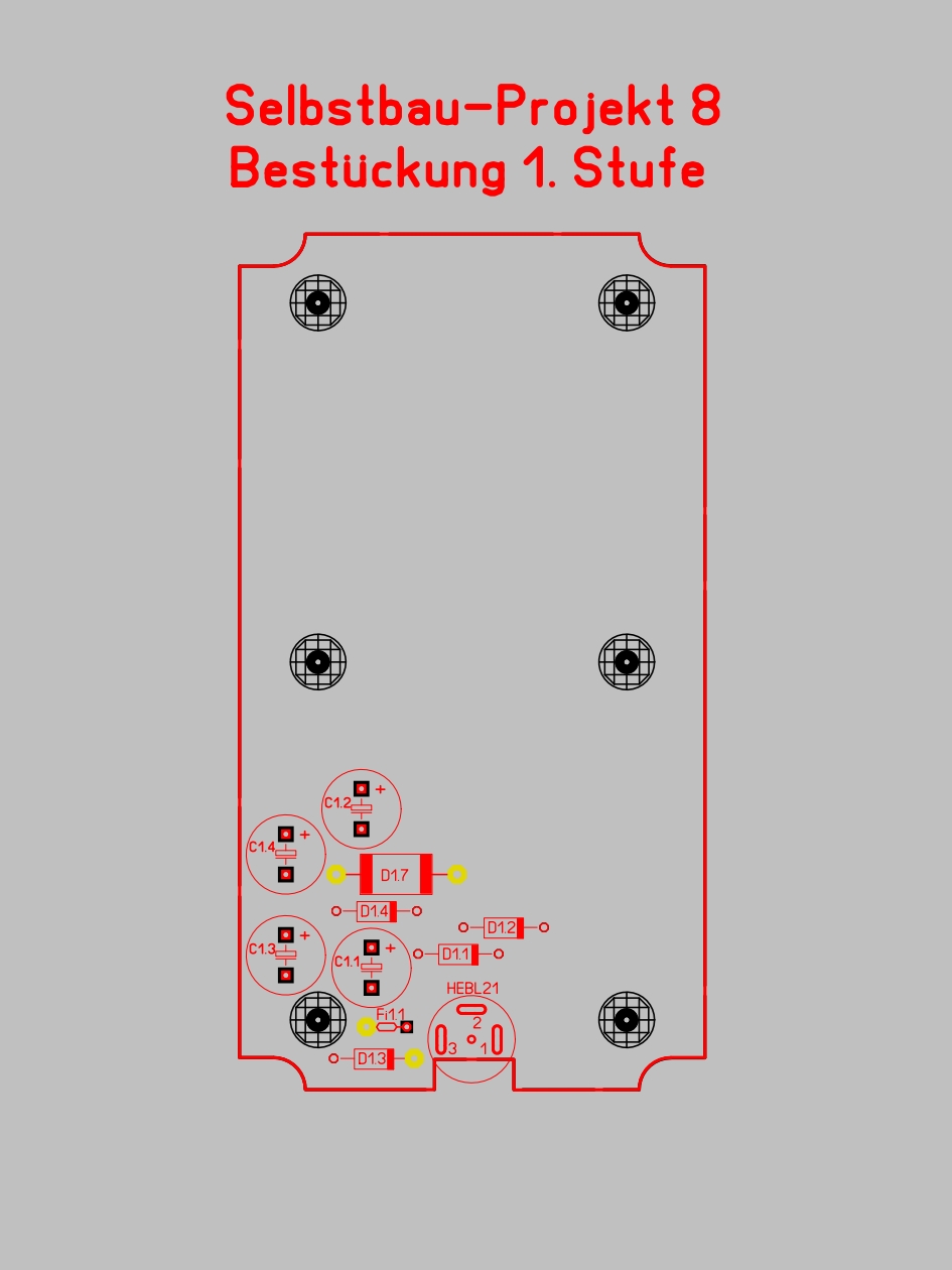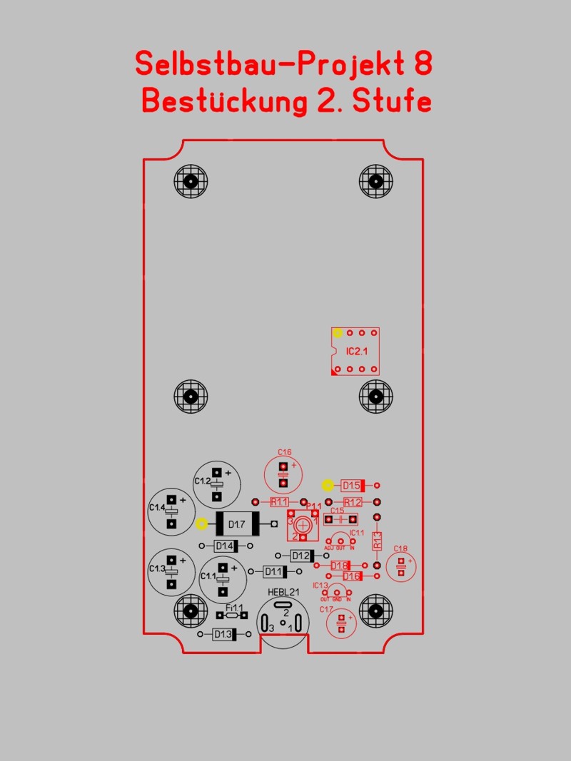 2. Baustufe Hier löten wir nun zusätzlich die rot gekennzeichneten Bauteile ein. Anschließend nehmen wir zwei Gleichspannungsmessungen vor. Den Schwarzen der Meßleitung legen wir an die gelbe Markierung von D1.7. Mit dem Roten Meßkabel gehen wir an die gelbe Markierung von D1.5 Dort muß eine Spannung anliegen, die wir an dem Trimmer P1 auf 60 Volt einstellen. (Später wird diese Spannung nochmals an den Elektroden gemessen und eingestellt.) Als Zweites messen wir mit dem Roten Meßkabel an der gelben Markierung von IC2.1 (das Schwarze bleibt an D1.7) Dort müssen wir eine Spannung von 12 Volt haben. Erst wenn diese Messungen erfolgreich waren, können wir weitere Bauteile einlöten.