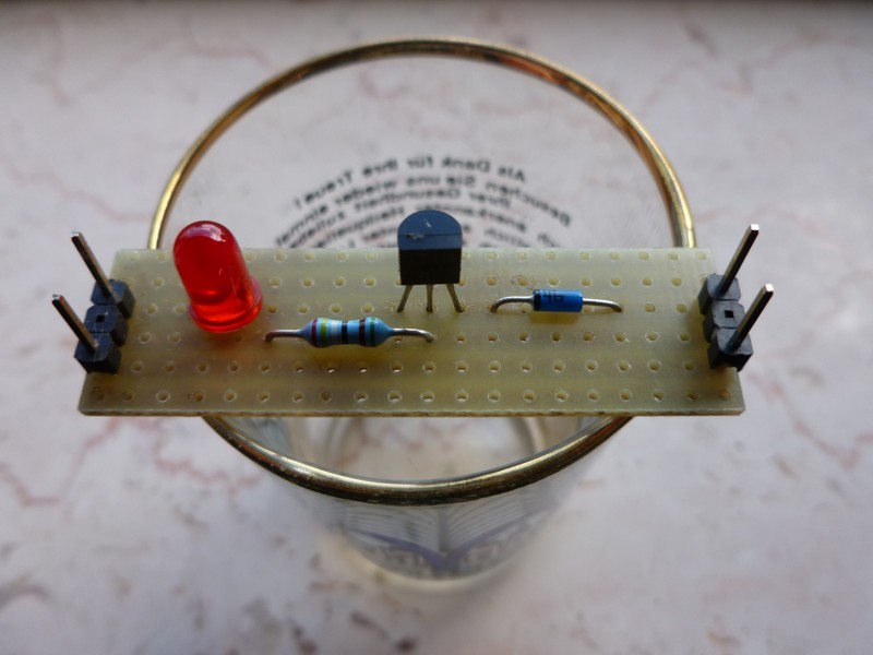 Und von unten werden die Drähte abgeschnitten und verlötet. Wie man sieht, werden die Drähte vom Widerstand an zwei Stellen umgebogen, damit sie auf die die nächste Kupferbahn hinüberreichen.