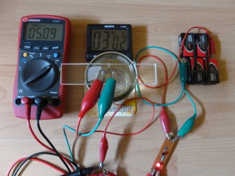 Das Gleiche im Details auf der Abbildung unten: Der Anschluß erfolgt "in Reihe" mit den Elektroden. Das heißt, der Strom kommt z.B. vom Minus der Batterien (Grün), geht auf eine Silber-Elektrode und von der anderen (Rot) geht es auf ein Kabel des Multimeters. (erst einmal egal, welches der beiden) Das andere Kabel des Multimeters wird am Plus der Batterien angeschlossen. (Rot) Auf diese Weise können wir beobachten, was sich tut. Beim Eintauchen der Elektroden in das (heiße) Wasser, wird sich zunächst ein niedriger Strom von 0,5 bis etwa 2 mA ergeben. Das ist immer unterschiedlich, hängt von der Qualität des Destillierten Wassers ab, aber auch davon, wie alt es ist, wie oft die Flasche schon geöffnet war (saugt Kohlendioxyd aus der Luft auf) und einigem, was wir gar nicht wissen. Auch Fett- und Spülmittelreste im Glas spielen eine Rolle. Anschließend kann man beobachten, wie der Strom langsam ansteigt und nach ein paar Minuten auf dem Sollwert von ca. 5 mA stehenbleibt. Das ist die wichtige Funktion "einer Strombegrenzung". (Nicht zu verwechseln, mit einem Widerstand, der das bei etlichen miserablen Pfusch-Geräten (für 60 - 100 Euro im Handel) übernehmen soll. Da soll man besser gar nichts kaufen, was für die Gesundheit ist.) Was man nicht unbedingt wissen muß: Auf dem Foto sehen wir, daß sich nach 3 Minuten ein Strom von 5,09 mA ergeben hat.