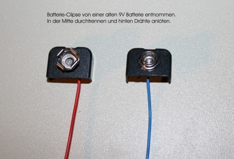 Wer das möchte, kann sich noch von einer alten Batterie die "Clipse" abmachen und Drähte anlöten.