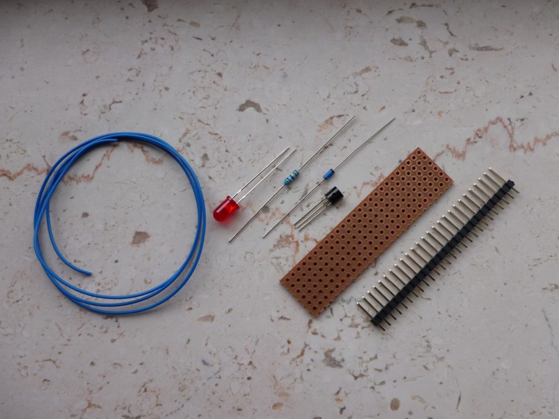Die Bauteile: Links und rechts ein 3-er Stück der Stiftleiste, aus dem der